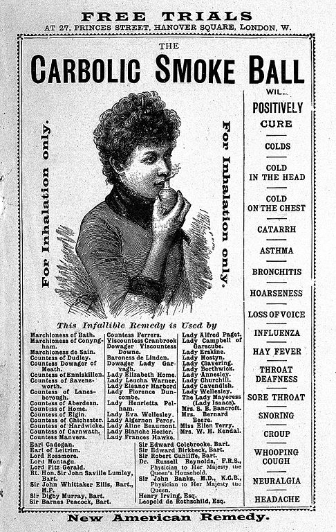 The Petitioner, believing Defendant’s advertisement that its product will prevent influenza, purchased a Carbolic Smoke Ball and used it as per the direction from November 20, 1891, until January 17, 1892, when she caught the flu. The Petitioner brought a legal suit to recover the 100£, which the Court found her qualified to recover. The Defendant appealed.
