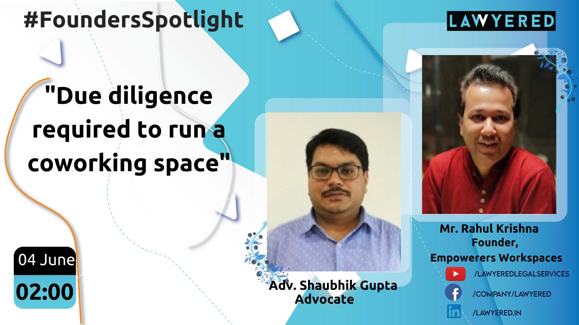 Lawyered is pleased to announce its new series #FoundersSpotlight. In this series, we bring together advocates and startup founders to discuss legal issues faced by entrepreneurs everyday and various strategies to overcome them. The next episode brings together Adv. Shaubhik Gupta, Advocate and Mr. Rahul Krishna, Founder at Empowerers Workspaces to discuss the "Due diligence required to run a coworking space"