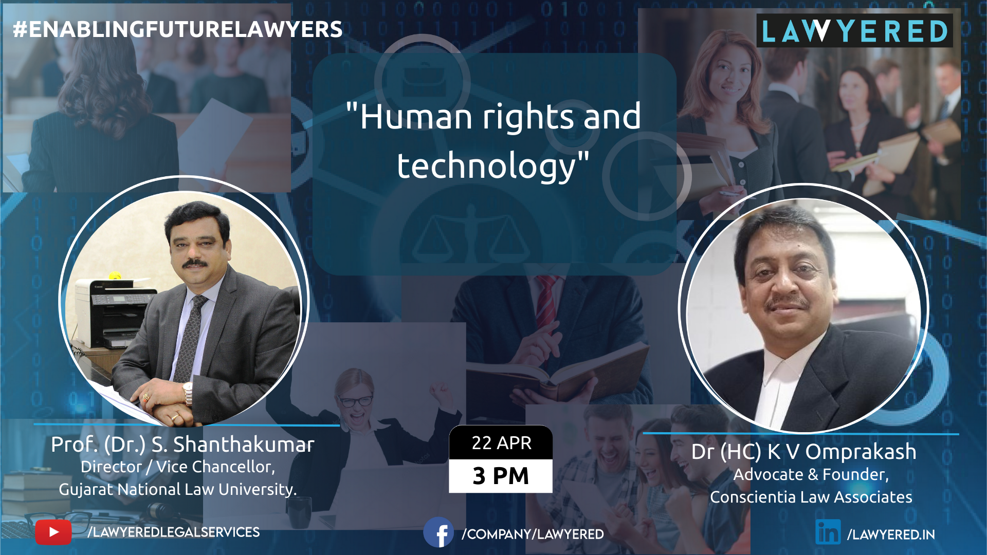 Presenting a one-of-its-kind month long talk show for chancellors/Vice-chancellors to know the present scenario of legal education and how the students are preparing themselves for the betterment of the nation.This series of events is to bring out the importance of legal knowledge and how it is equipped in the students. The next episode brings together Dr. (HC) K V Omprakash, Advocate & Founder, Conscientia Law Associates and Prof. Prof. (Dr.) S. Shanthakumar, Director / Vice Chancellor of Gujarat National Law University to discuss the current scenario of legal education and how technology & human rights are connected.