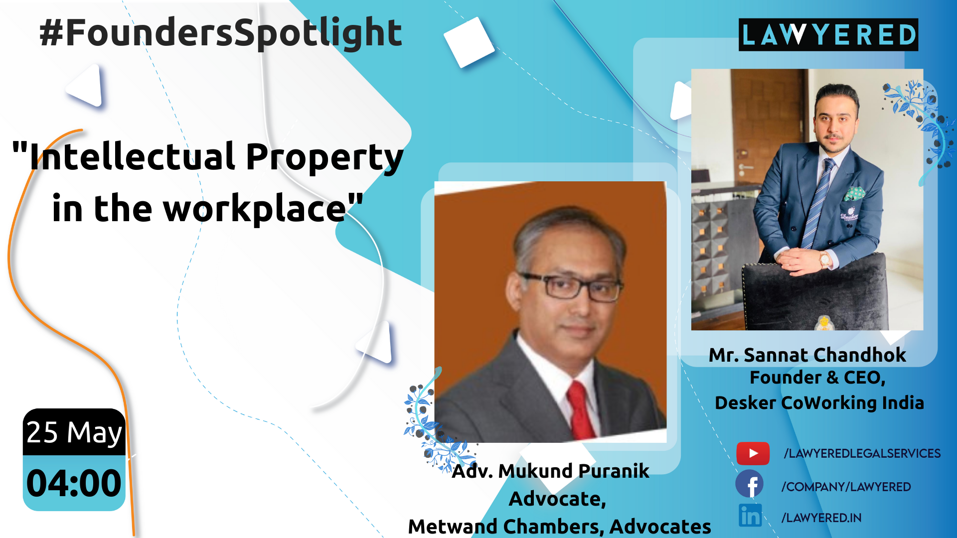 Lawyered is pleased to announce its new series #FoundersSpotlight. In this series, we bring together advocates and startup founders to discuss legal issues faced by entrepreneurs everyday and various strategies to overcome them. The next episode brings together Adv. Mukund Puranik, Advocate, Advocate, Metwand Chambers, Advocates and Mr. Sannat Chandhok, Founder & CEO at Desker CoWorking India to discuss the 'Intellectual Property in the workplace.