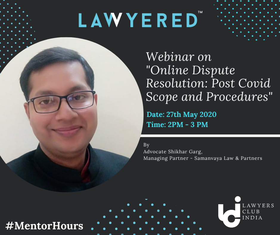 Lawyered presents the next edition of #MentorHours in collaboration with LAWyersClubIndia on 'Online Dispute Resolution: Post COVID Scope and Procedures'.