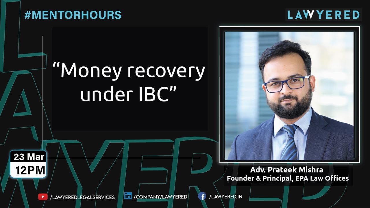 Lawyered is pleased to announce its next session of #MentorHours on 'Money recovery under IBC' by Adv. Prateek Mishra who will explain the procedure of money recovery and what was the need of IBC when different statutes were already there.