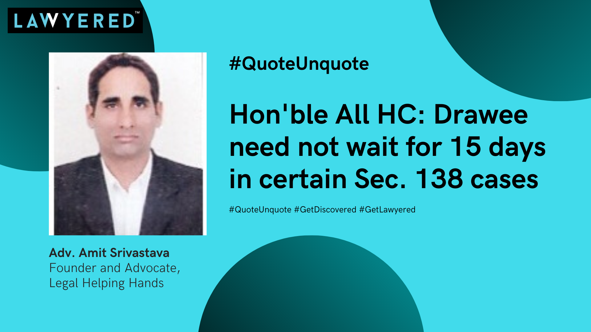 Lawyered presents the next video in its brand new video series: #QuoteUnquote. See Adv. Amit Srivastava discuss the Hon'ble Allahabad High Court's judgment holding that the drawee of a cheque need not wait for 15 days before approaching the appropriate forum in certain Sec. 138 NIA cases.